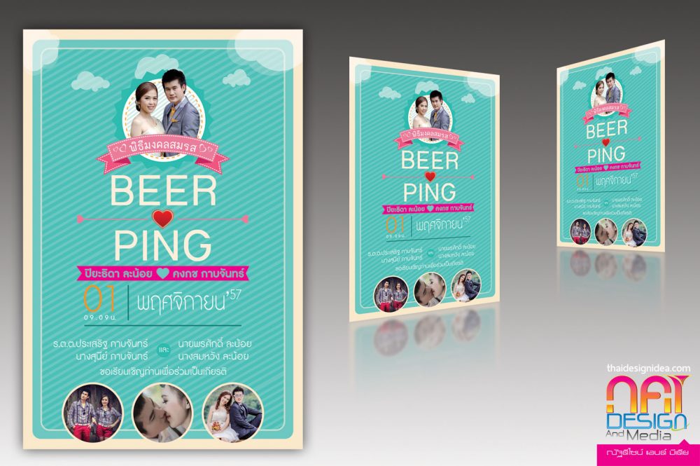 ตัวอย่างงานออกแบบการ์ดเชิญ พิธีมงคลสมรส beer & ping ในสไตล์ โมเดิร์น เน้นความเรียบหรู ยืนสีพื้นที่ดูแล้วเย็นสบายตา หวานๆ เติมเต็มความน่ารักของแบบด้วยก้อนเมฆ เน้นรูปภาพเด่นเพียงรูปเดียวคือไดคัทรูปแล้ววางไว้ด้านบน ให้ใหญ่เกินกรอบภาพ เพื่อความมีมิติ เพิ่มลูกเล่นด้วยรูปหัวใจ นำเทคนิคริปบิ้นแบบ Flat Style มาใช้เล็กน้อย ต่อด้วยรูปภาพทางเลือกในฉาก Pre-Wedding