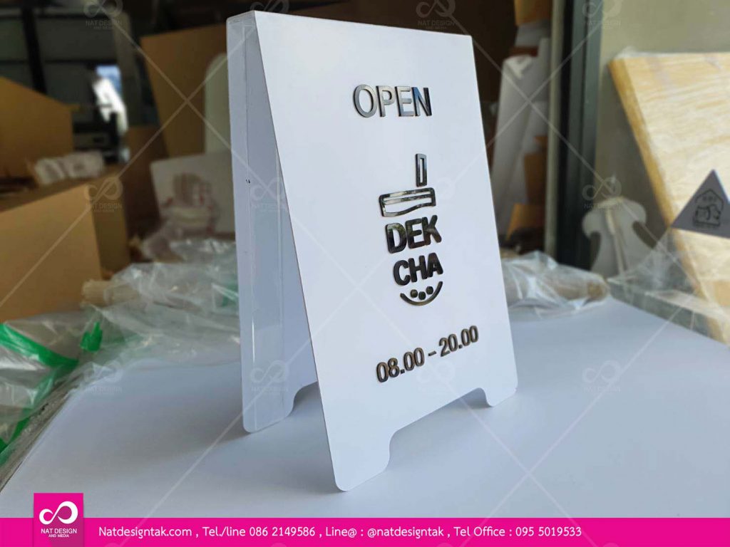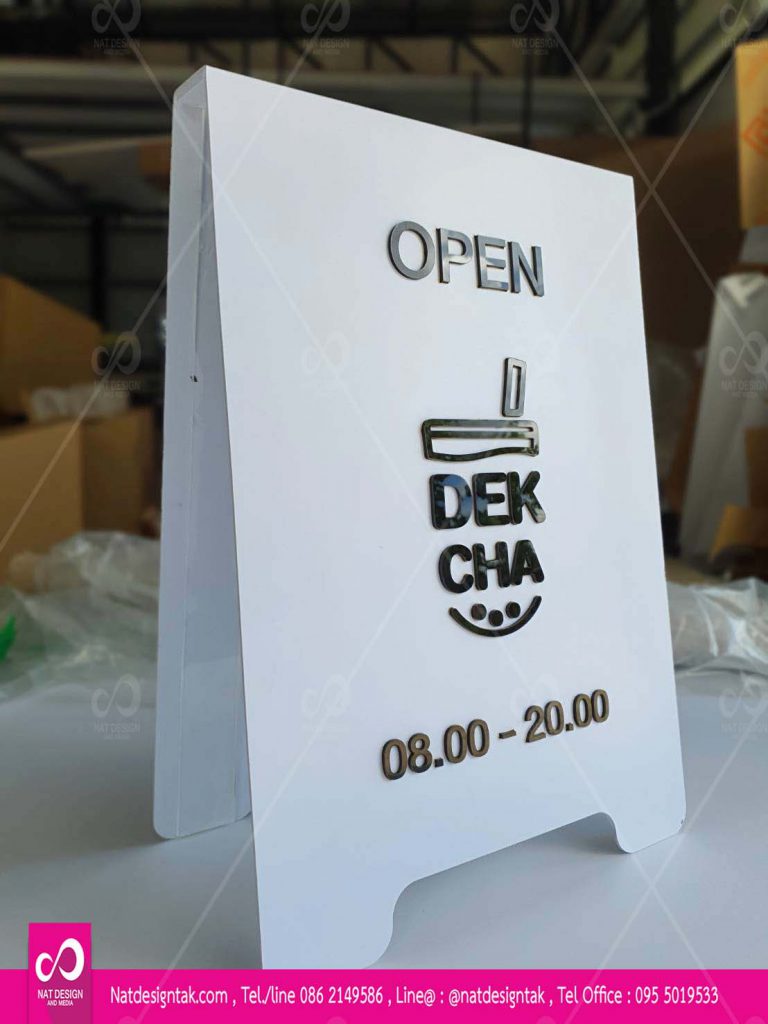 ป้ายตั้งหน้าร้านพลาสวูดขนาด3มิล ติดตัวอักษรอะคริลิคดำ เพิ่มความแข็งแรงด้วยอะคริลิคใส